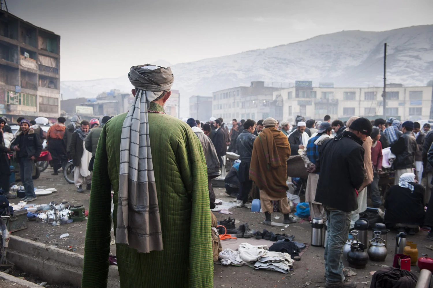 Day laborers wait outside the Pashto Market in downtown Kabul hoping to be chosen to work for the day. Workers make 250 Afghans (3-5 dollars) a day and often come from provinces in Afghanistan to seek out the unregulated labor market and often live in squalid conditions in order to send more money home.